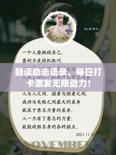 在这个充满挑战与机遇的时代,我们需要一种力量,一种激励我们不断前行的力量,打卡朗读励志语录,就是这样一股力量,它像明灯照亮我们的前行之路,让我们在人生的旅途中,充满斗志,勇往直前。
